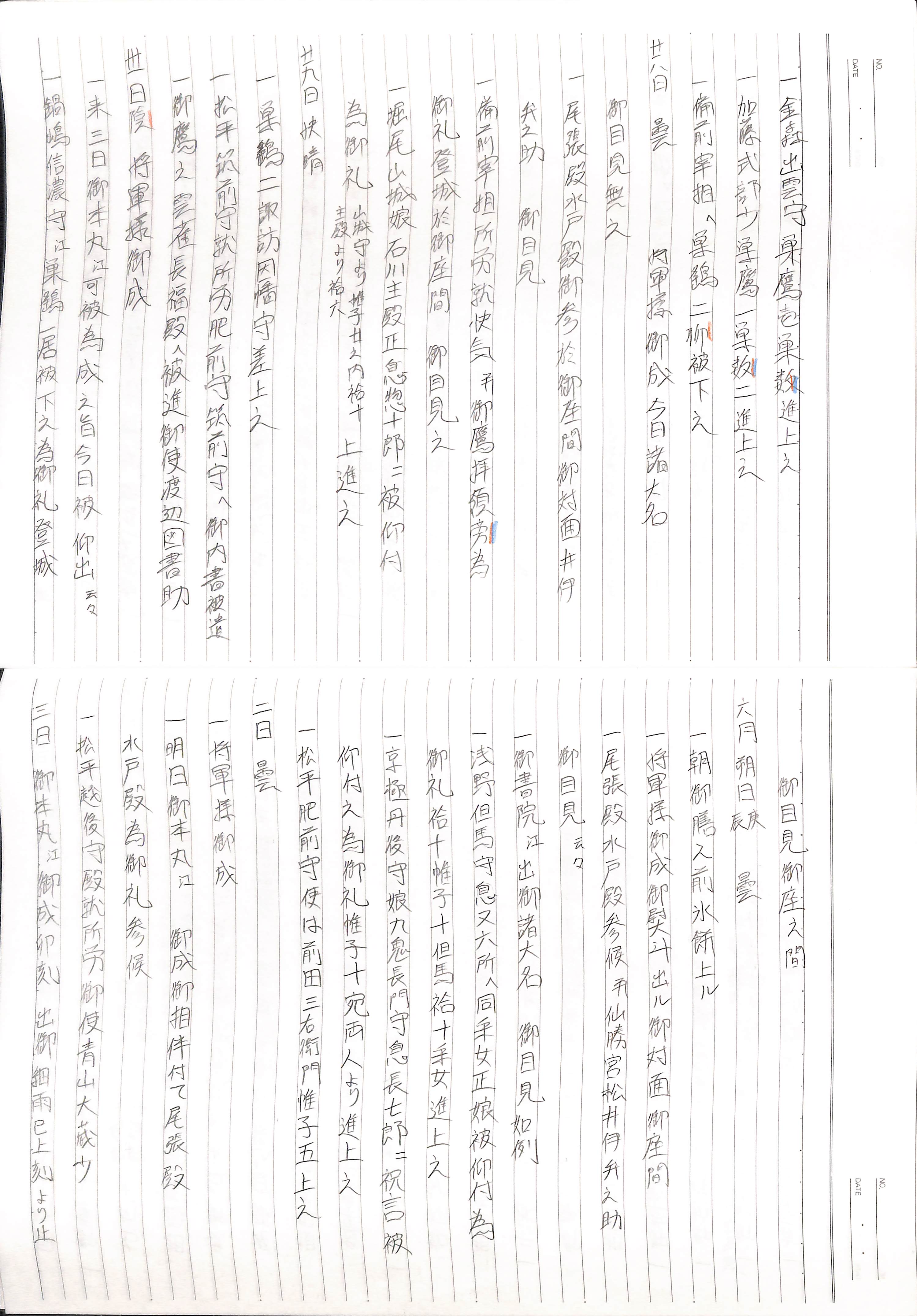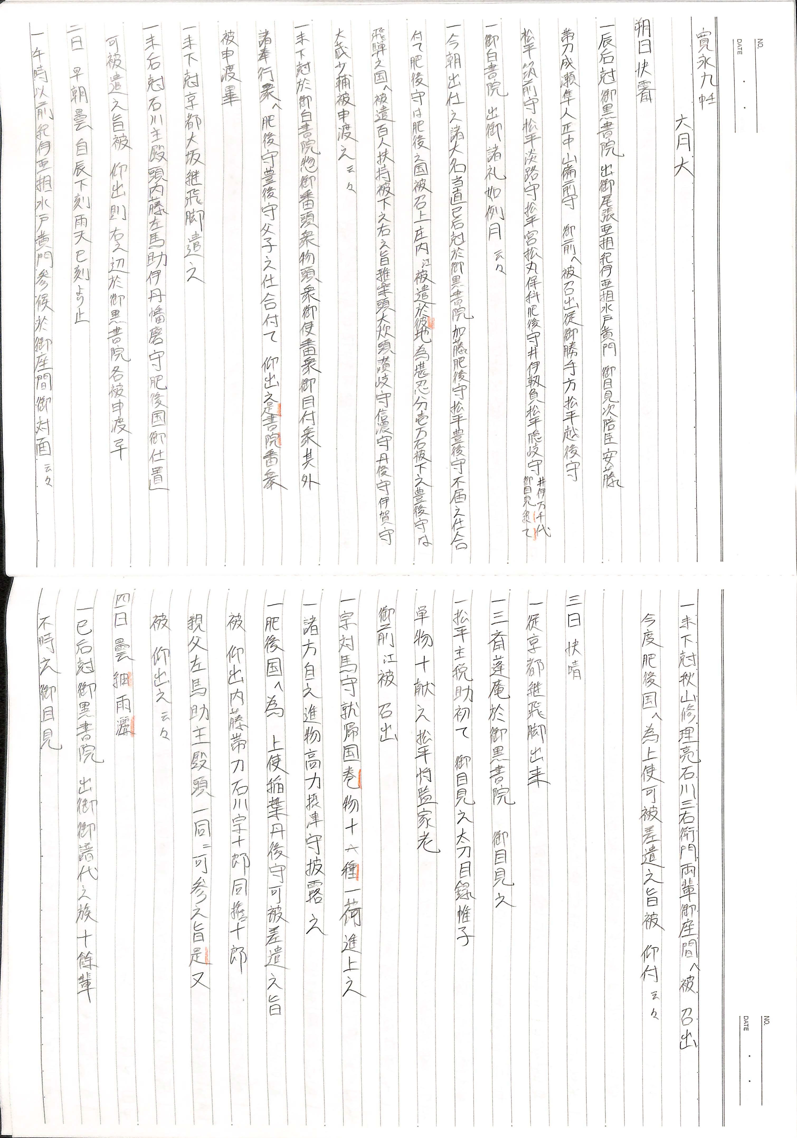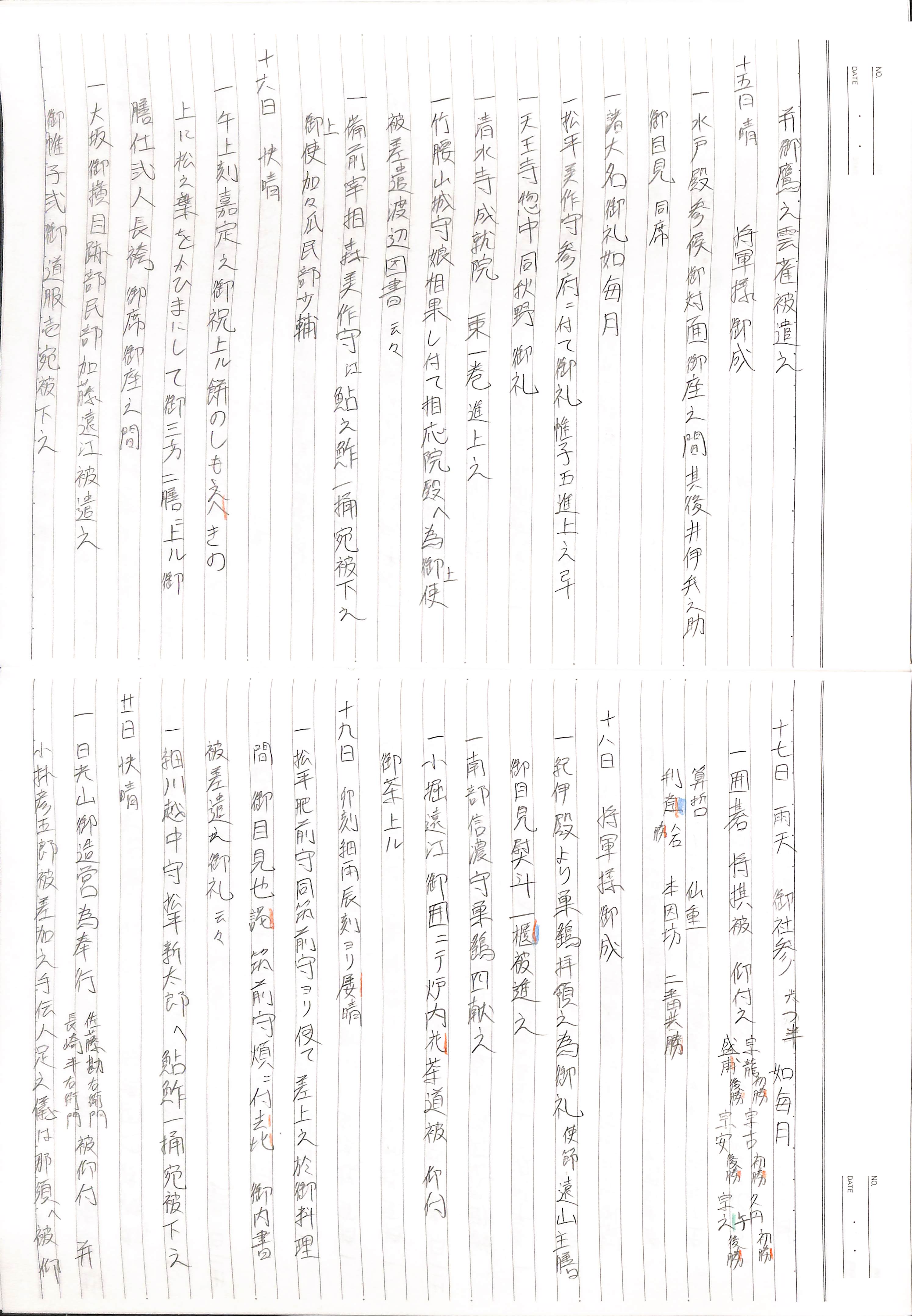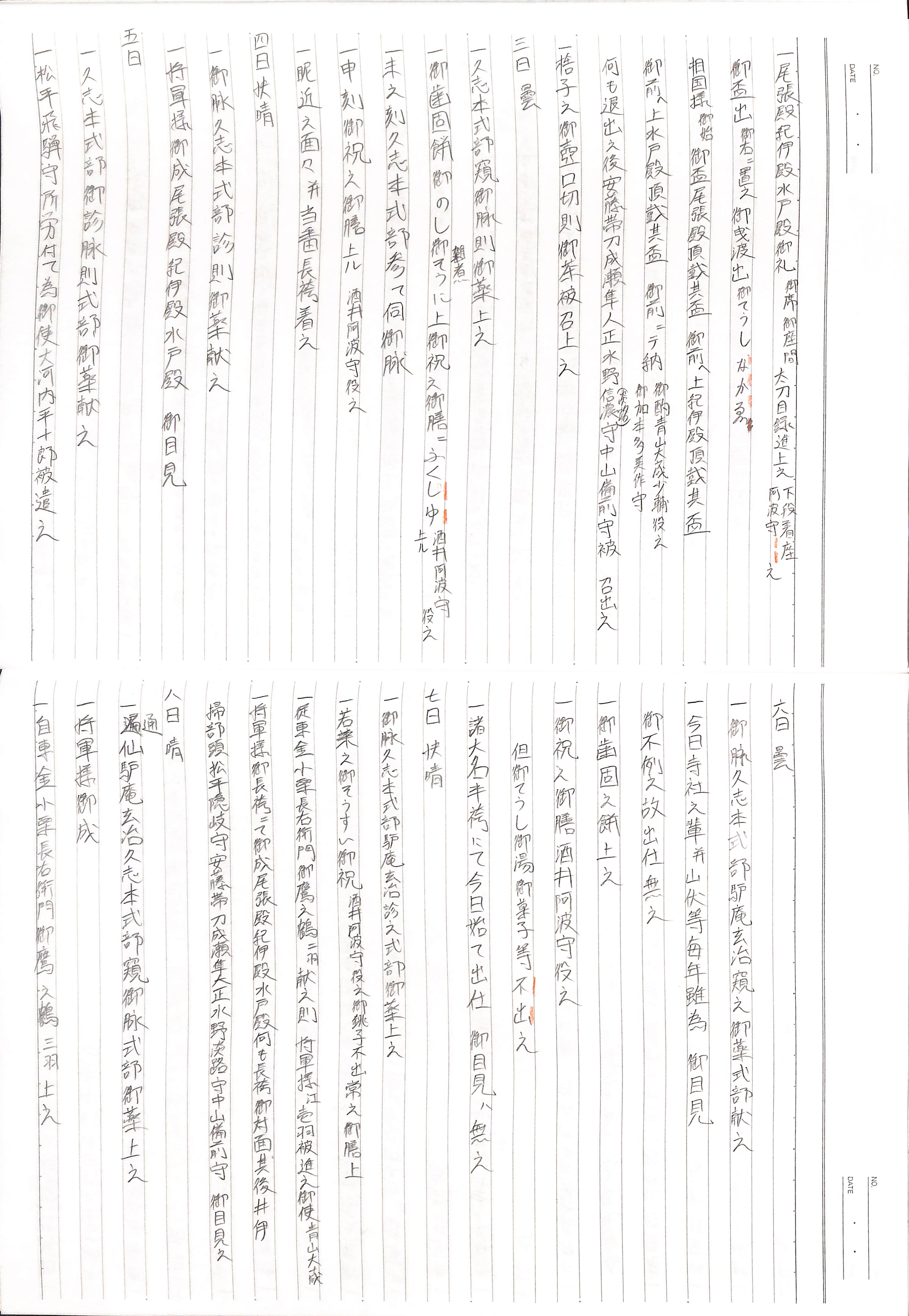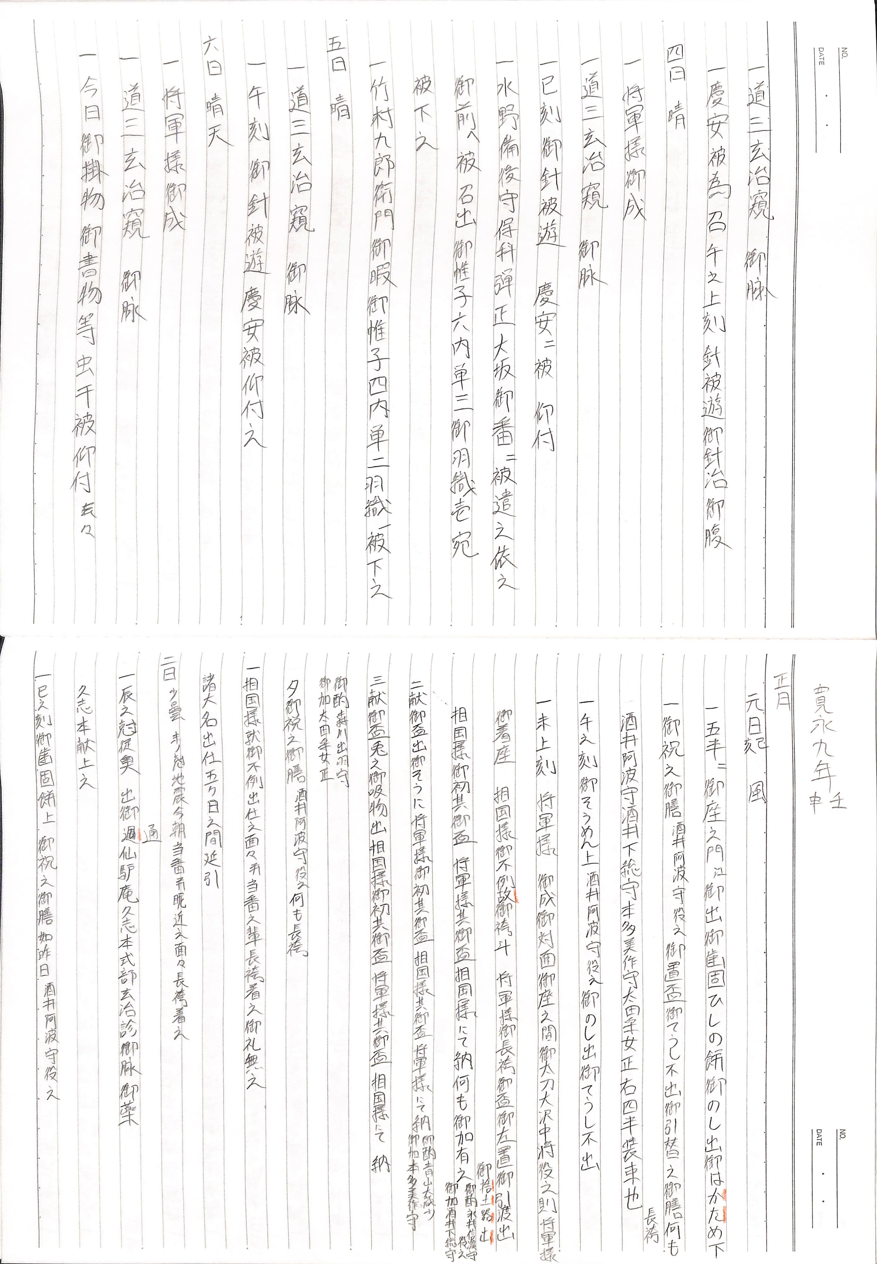 2 藤井讓治監修『江戸幕府日記姫路酒井家本』第1巻(ゆまに書房、2003年)より作成。原史料は姫路市立城郭研究室所蔵。 1へ 寛永8年5月5日~7月6日 寛永9年1月1日~1月25日 寛永9年6月1日~7月7日 3へ