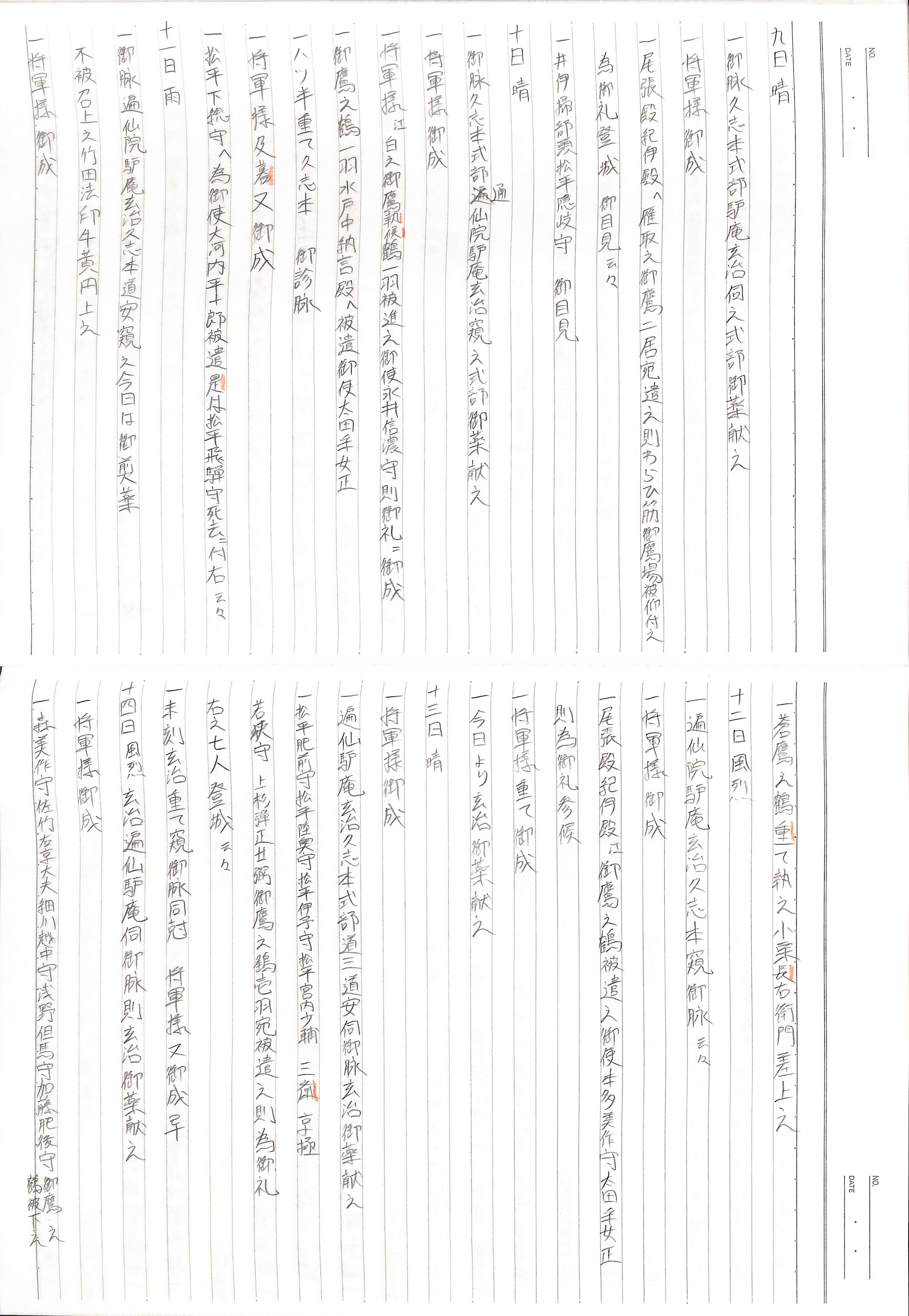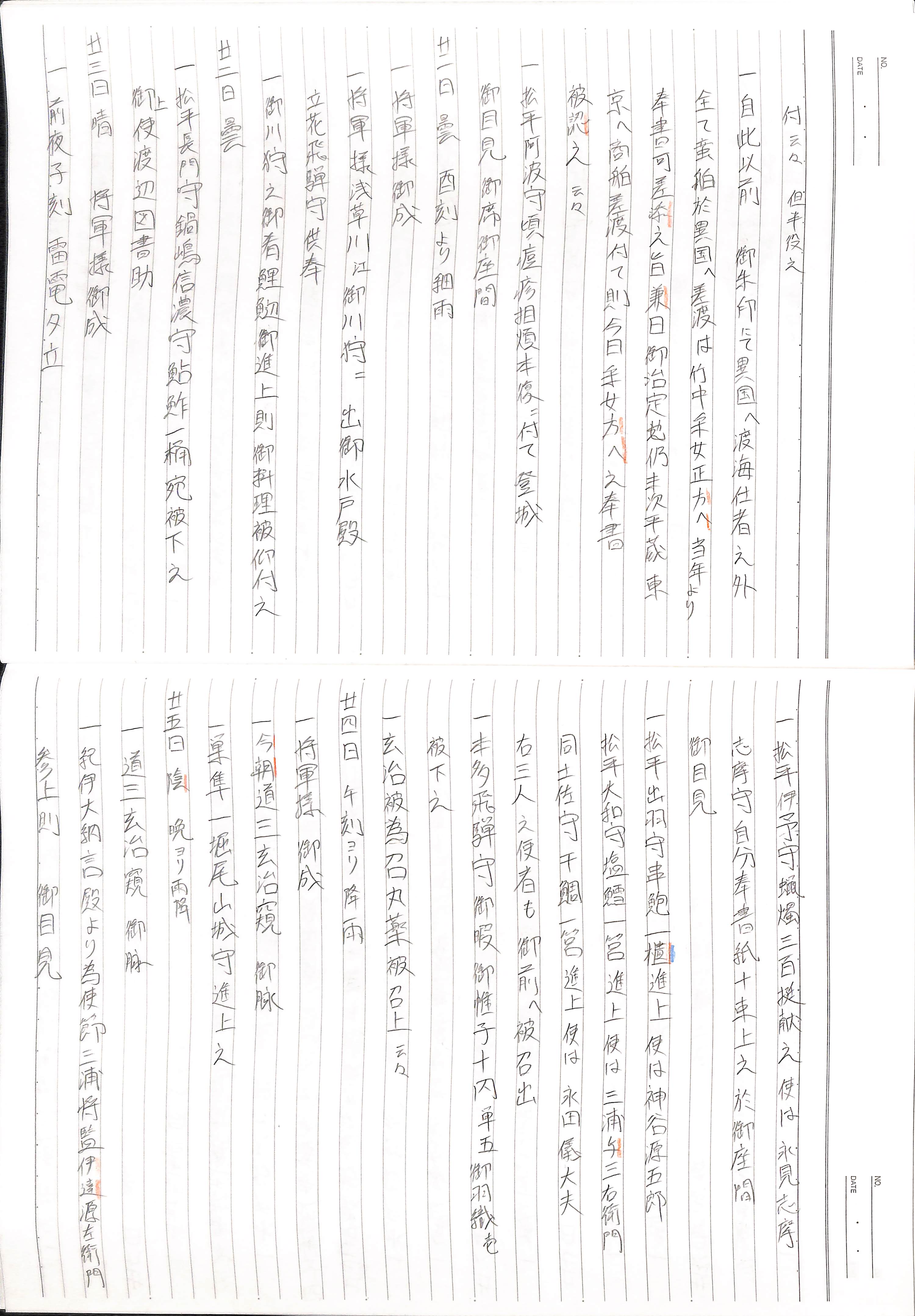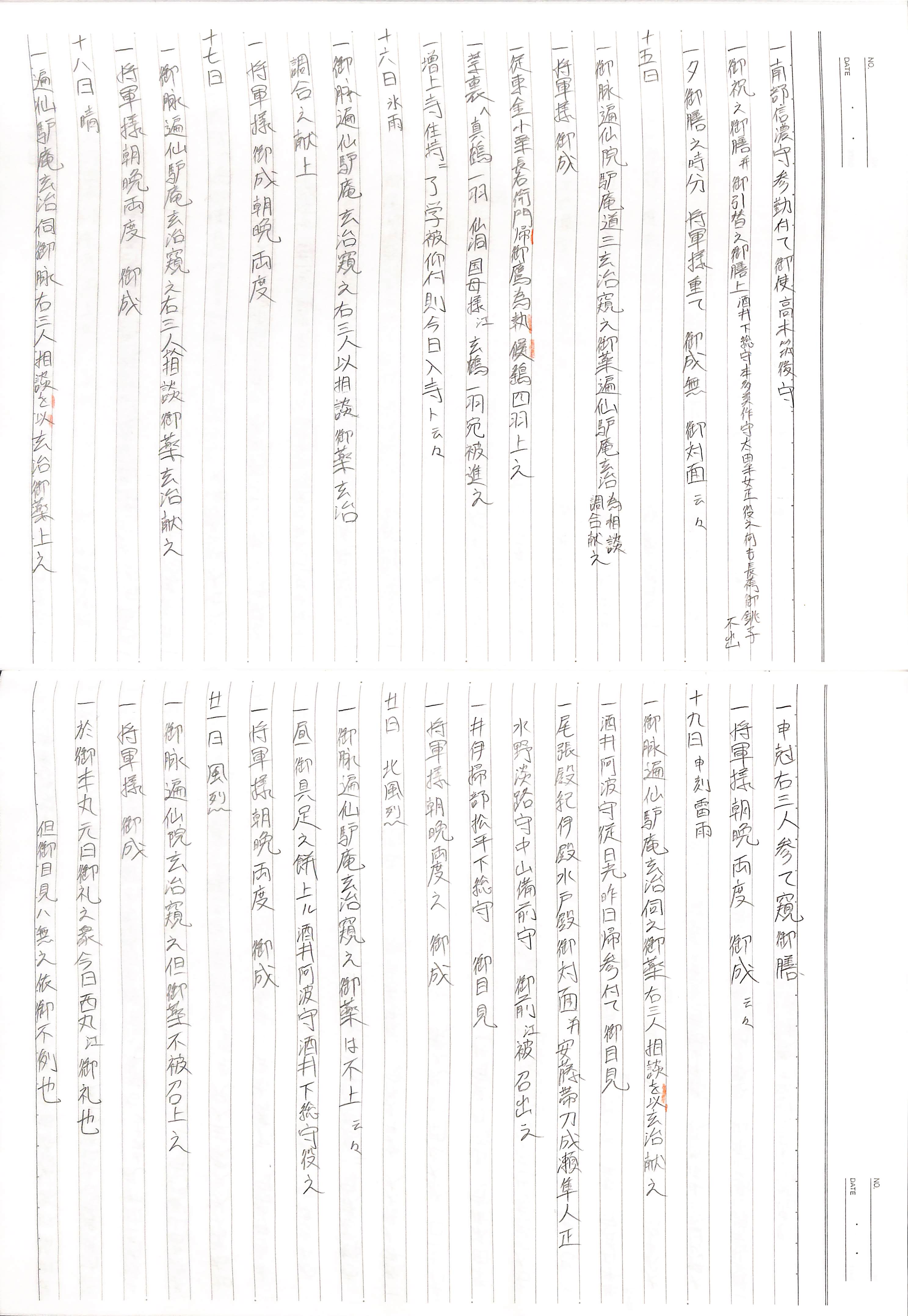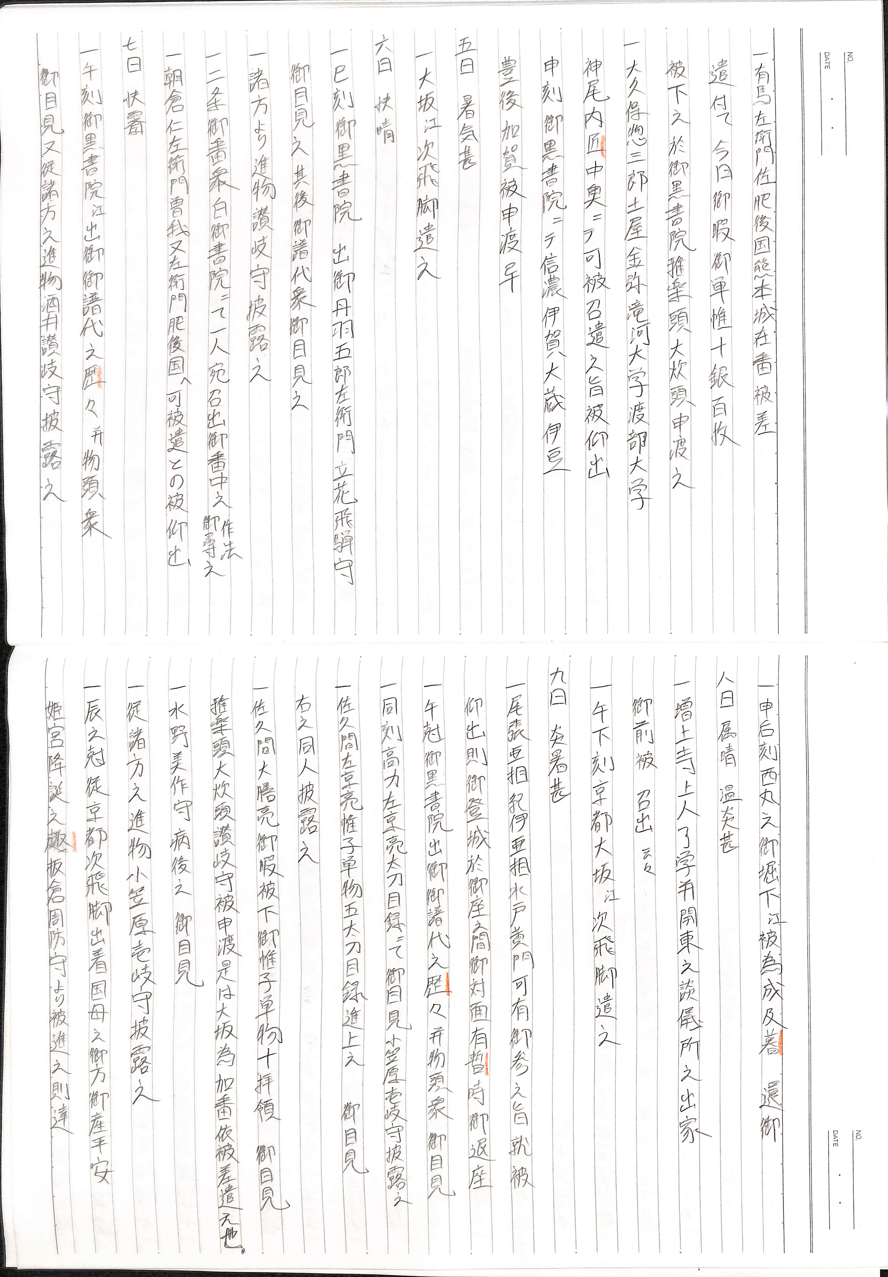 2 藤井讓治監修『江戸幕府日記姫路酒井家本』第1巻(ゆまに書房、2003年)より作成。原史料は姫路市立城郭研究室所蔵。 1へ 寛永8年5月5日~7月6日 寛永9年1月1日~1月25日 寛永9年6月1日~7月7日 3へ