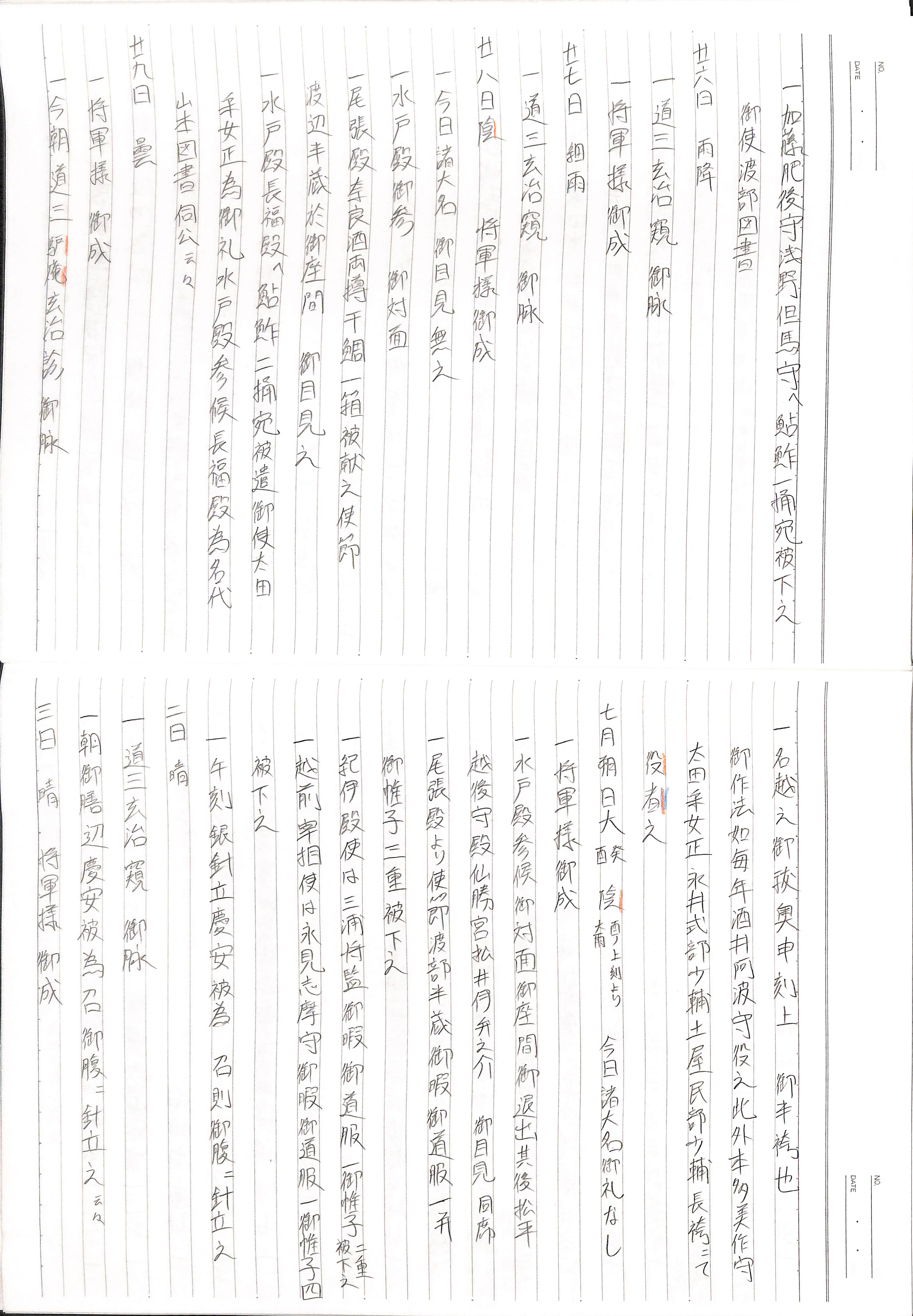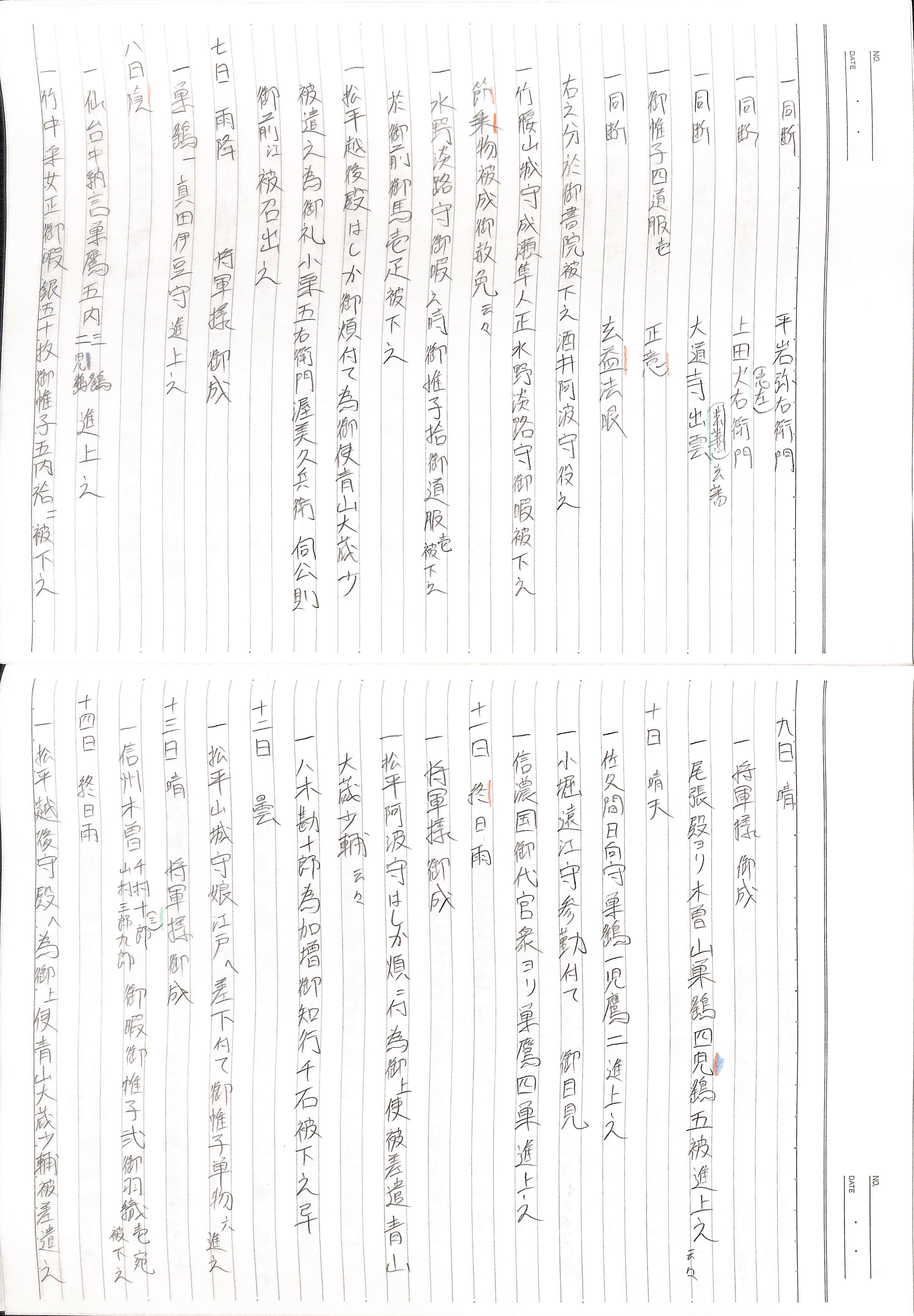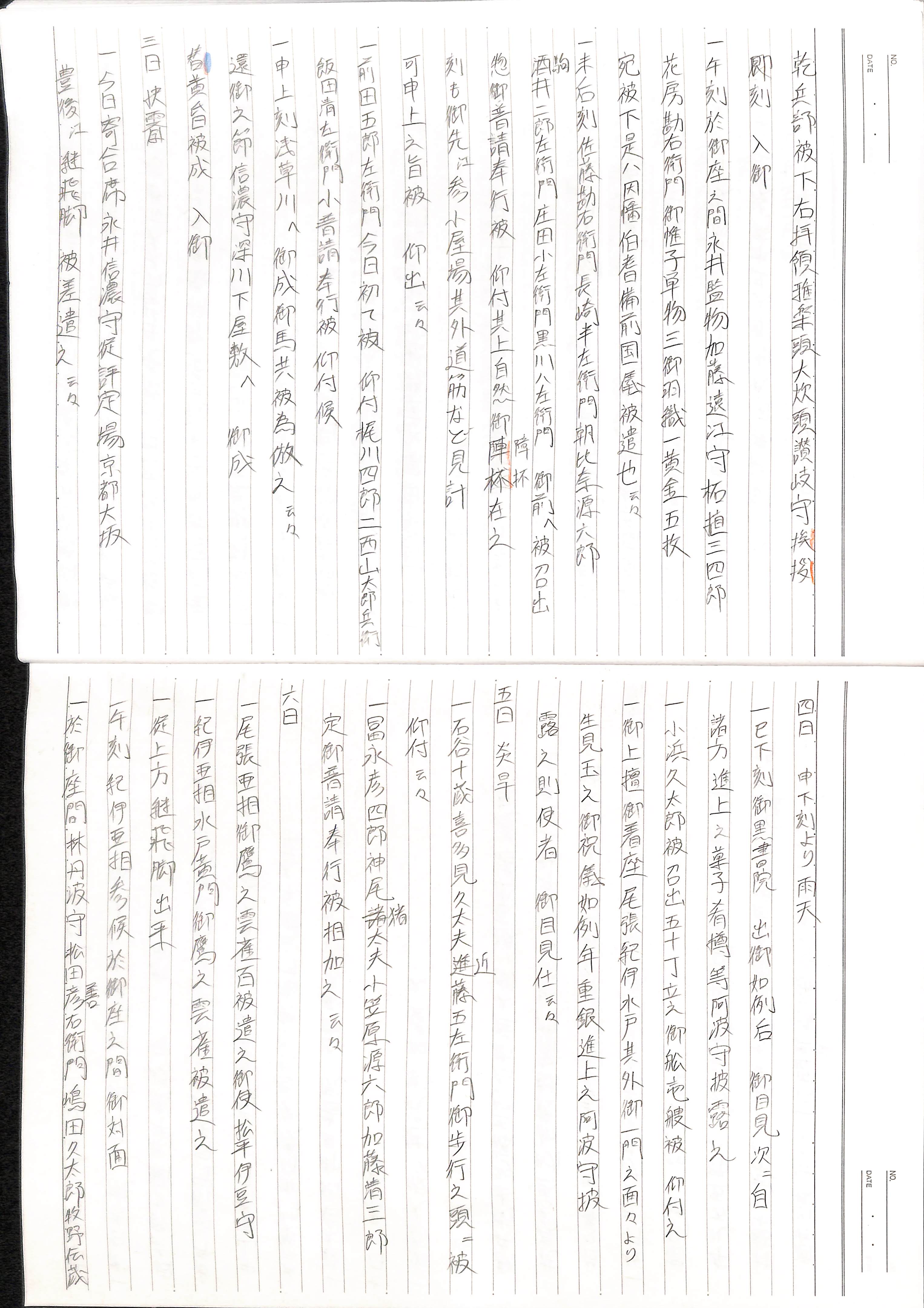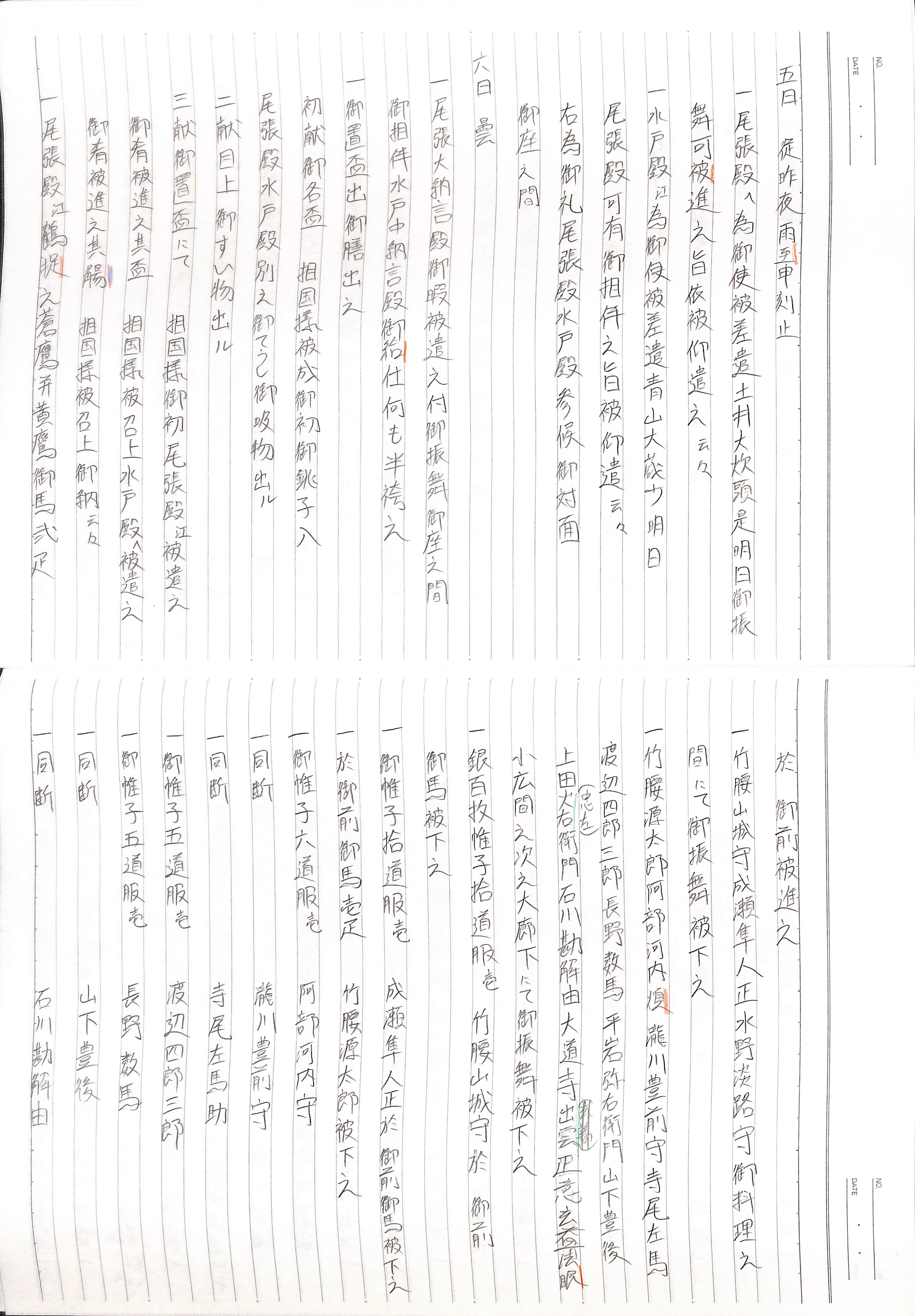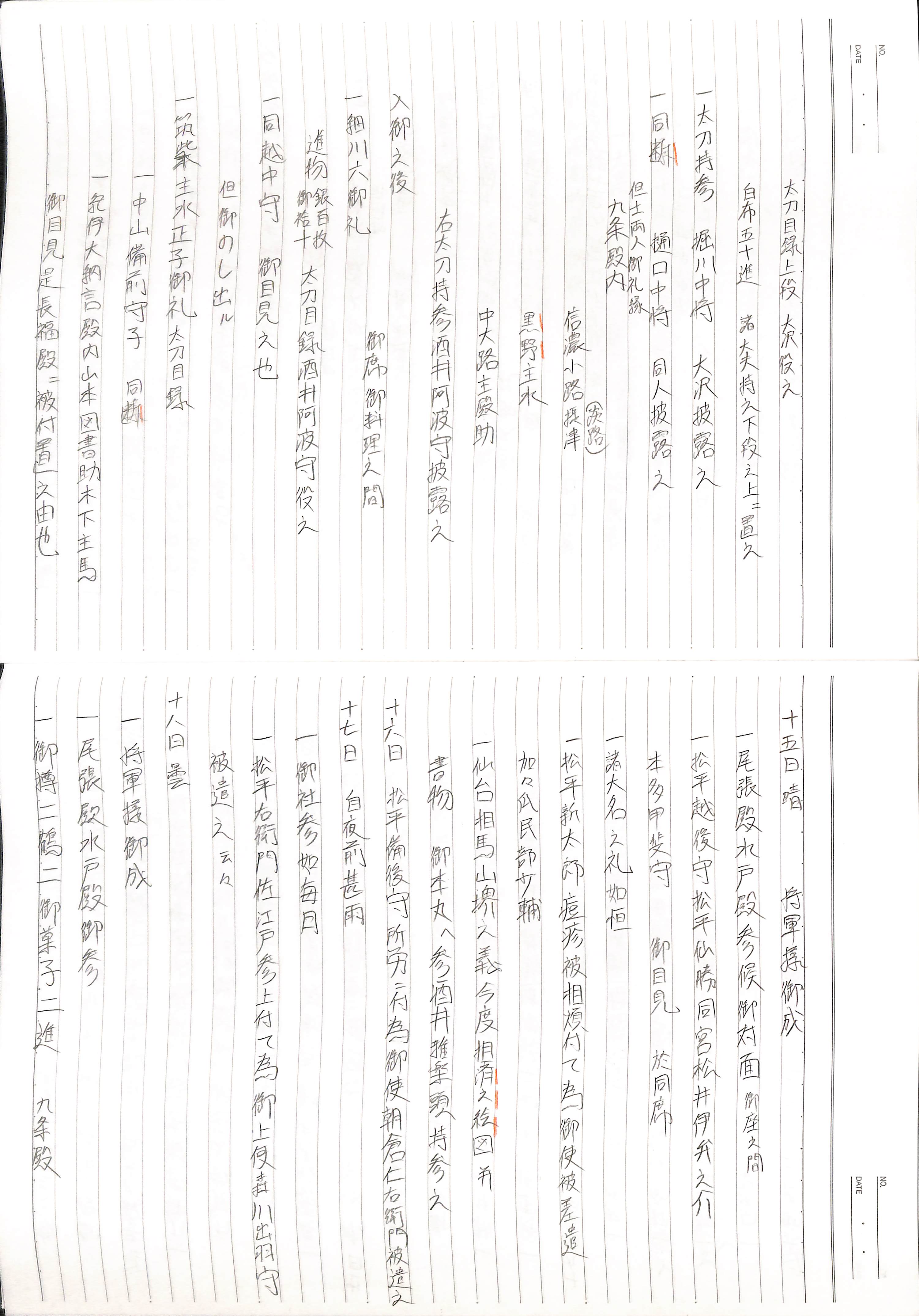2 藤井讓治監修『江戸幕府日記姫路酒井家本』第1巻(ゆまに書房、2003年)より作成。原史料は姫路市立城郭研究室所蔵。 1へ 寛永8年5月5日~7月6日 寛永9年1月1日~1月25日 寛永9年6月1日~7月7日 3へ