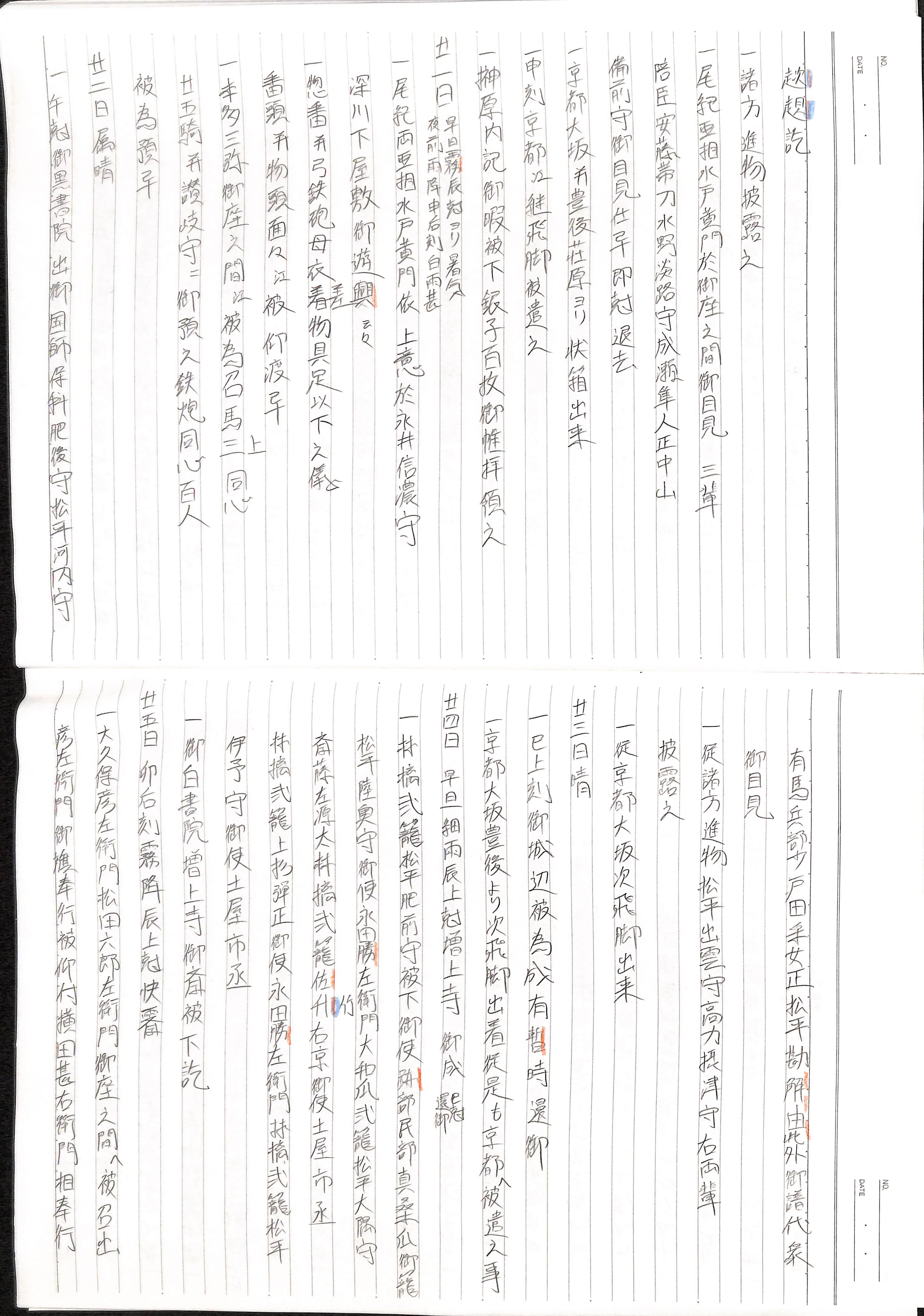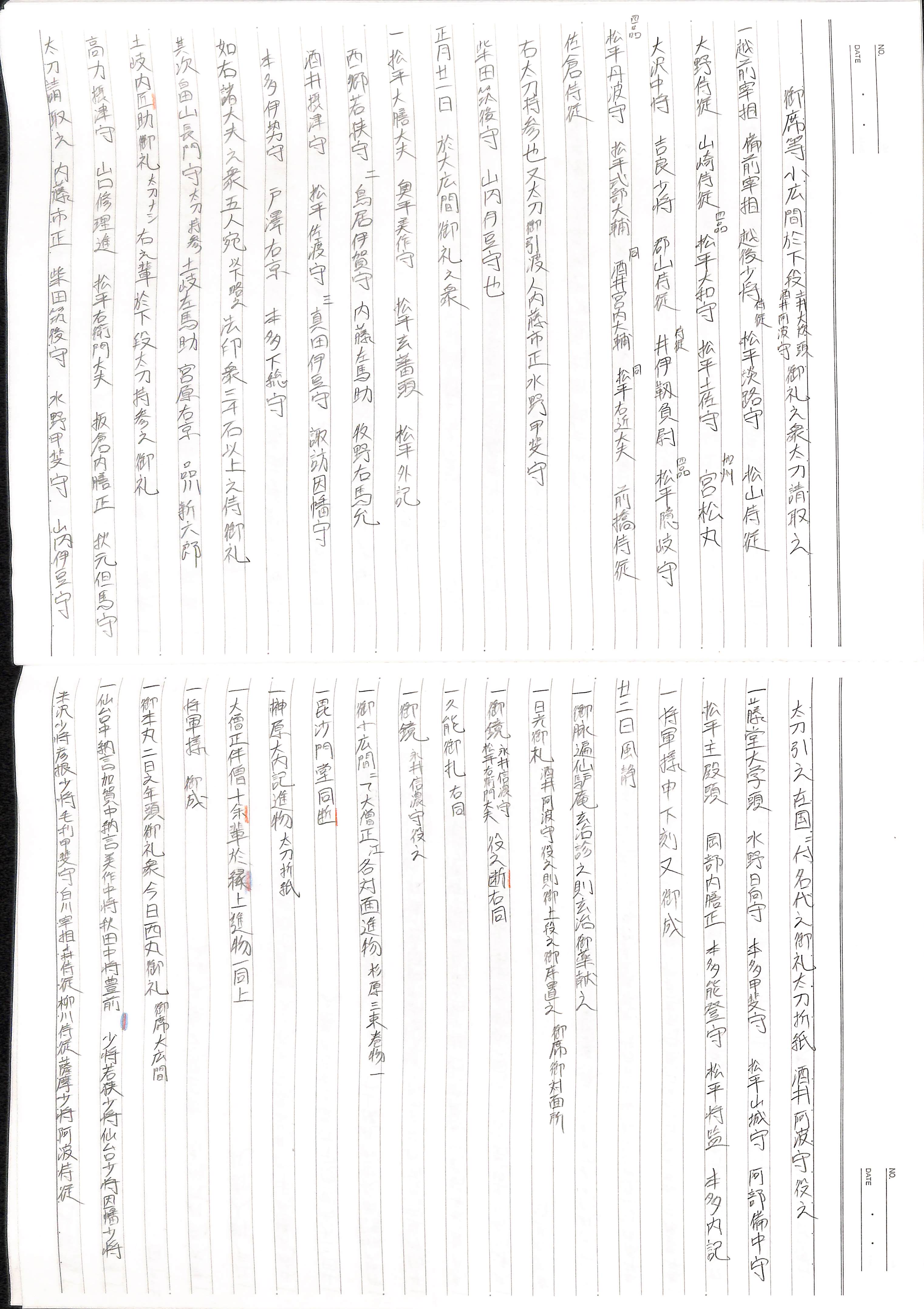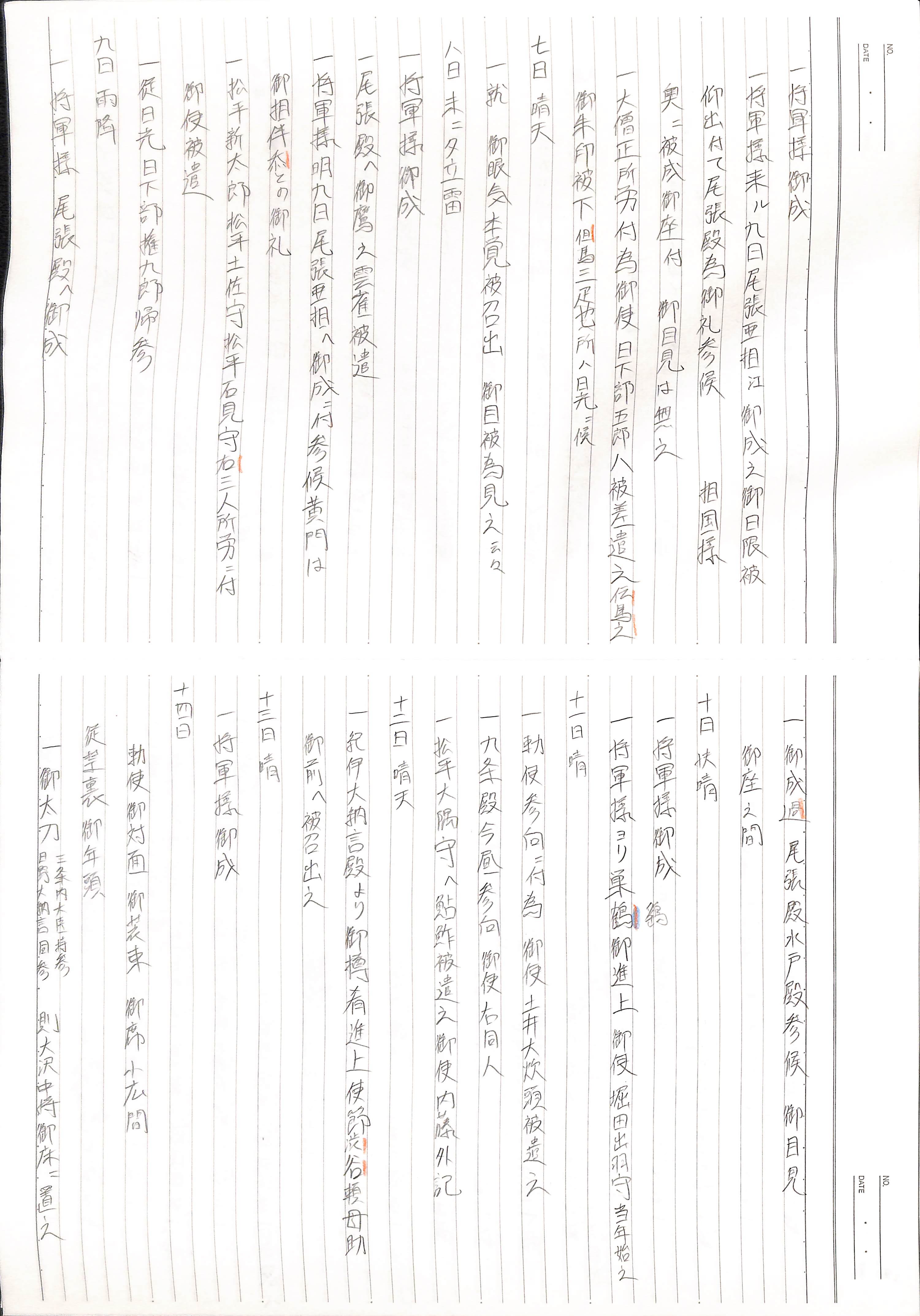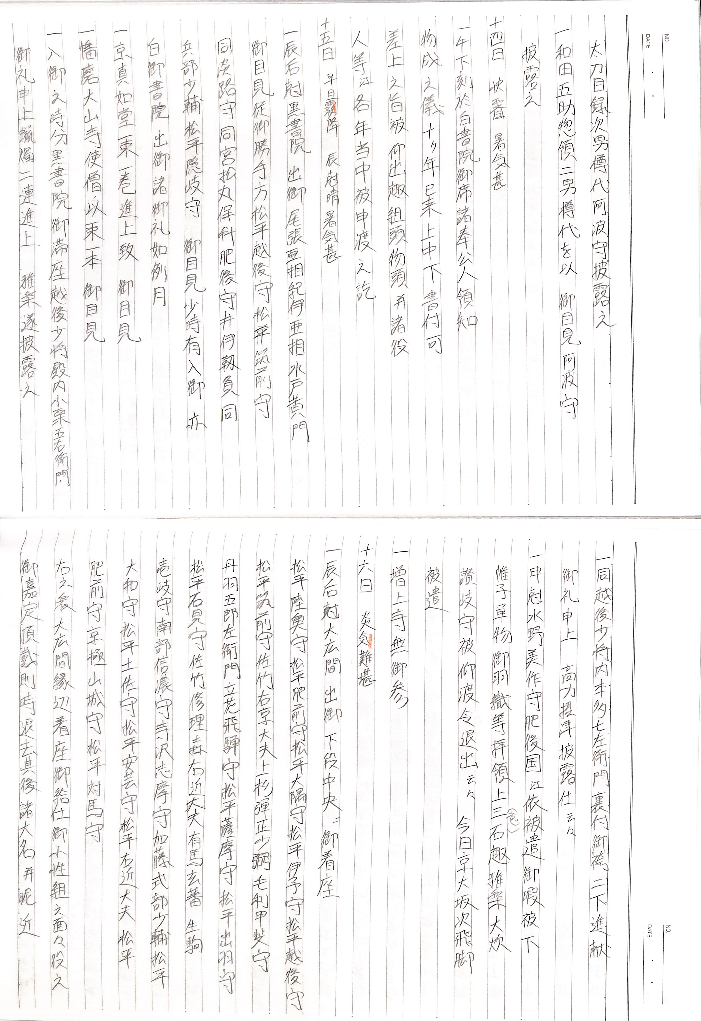 2 藤井讓治監修『江戸幕府日記姫路酒井家本』第1巻(ゆまに書房、2003年)より作成。原史料は姫路市立城郭研究室所蔵。 1へ 寛永8年5月5日~7月6日 寛永9年1月1日~1月25日 寛永9年6月1日~7月7日 3へ